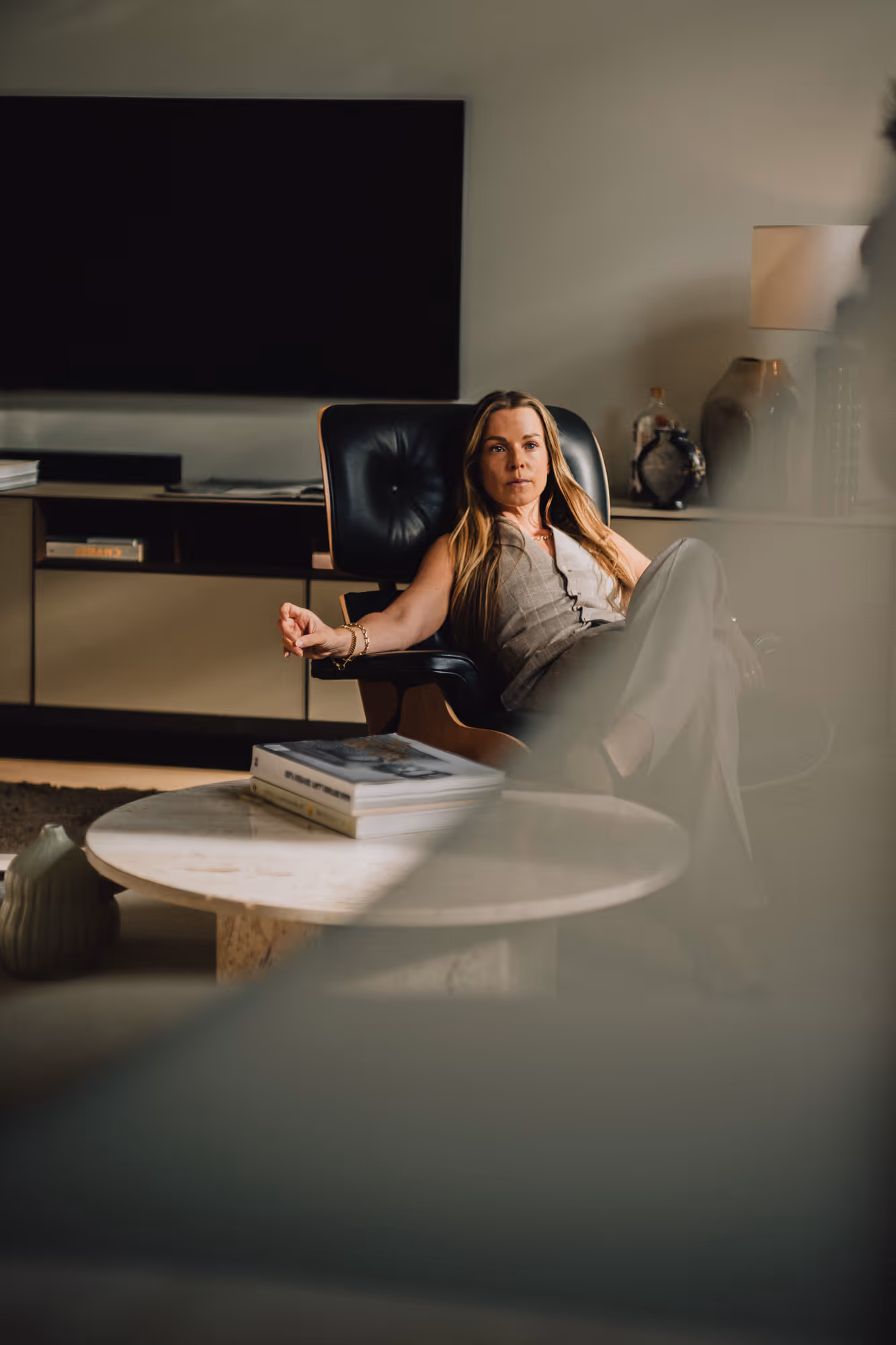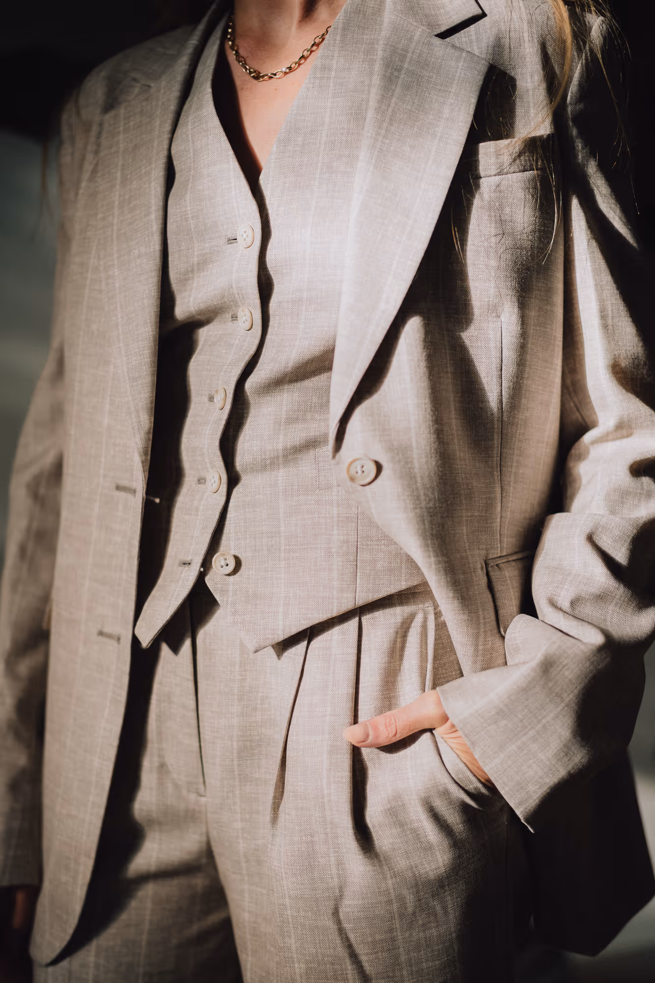 Photographed in her Amsterdam home, Maddie wears a custom three-piece suit in lightweight beige wool with a subtle white stripe, made precisely to her measurements. A reflection of her poise and determination, the suit captures the balance between structure and ease that defines both her style and her approach to leadership.